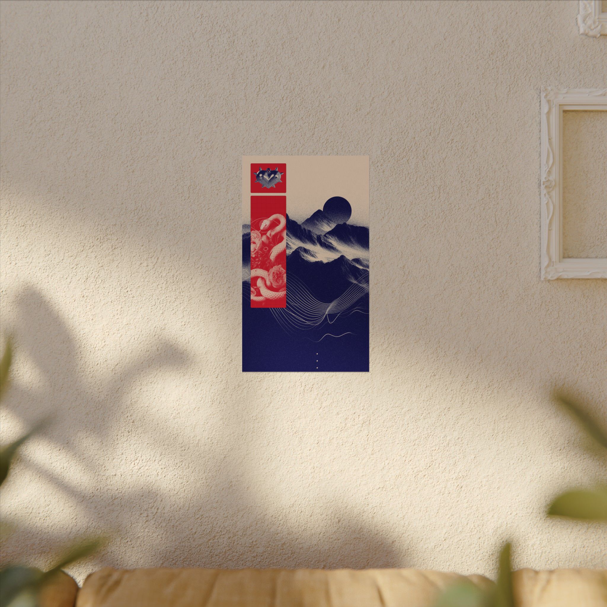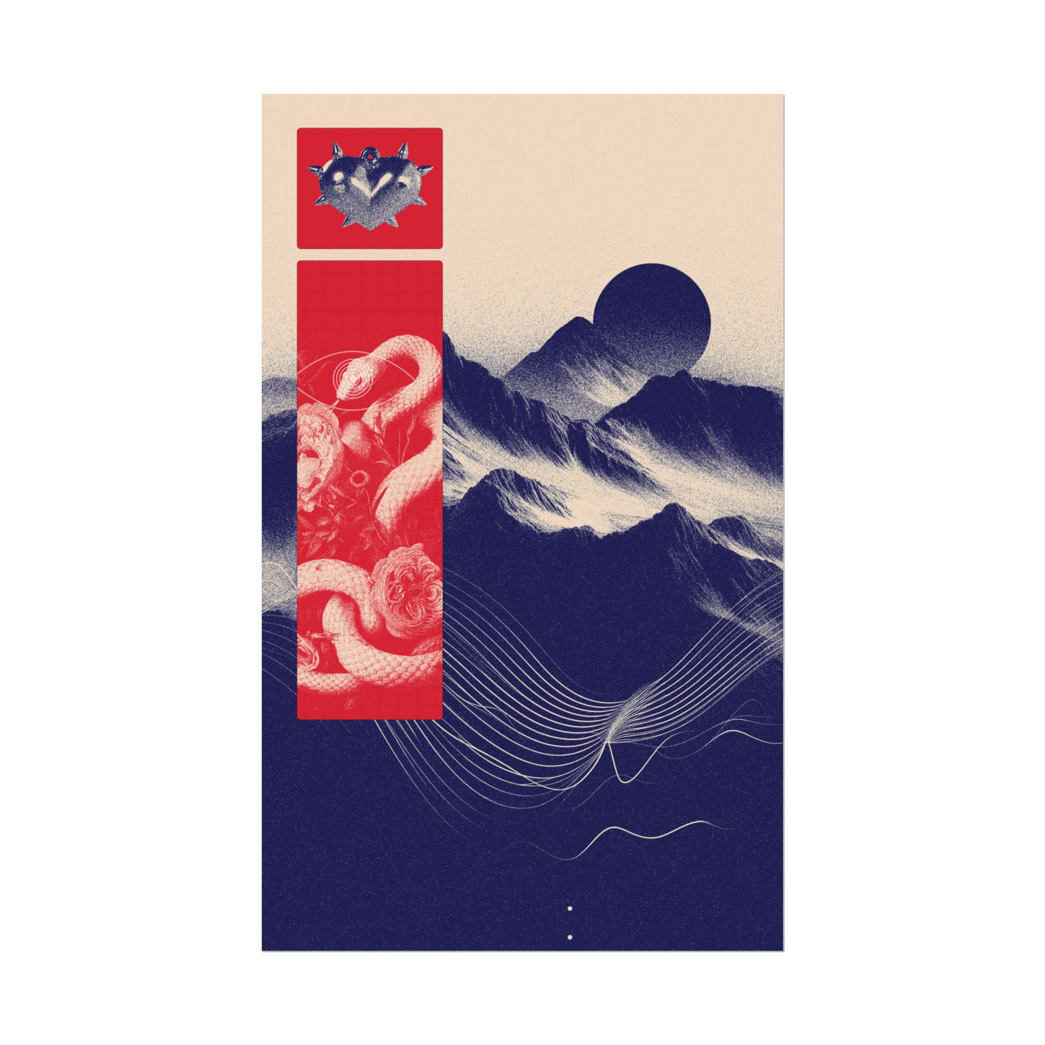 Heart of Thorns is printed on 285gsm matte watercolor paper using archival inks for rich tone and lasting clarity. The image pairs signature indigo with striking red, placing a coiled snake among florals and layered landscapes. With fine texture and bold contrasts, the composition moves between organic forms and sharp structure. It’s a carefully made print with a strong visual rhythm that holds attention without overpowering its surroundings.