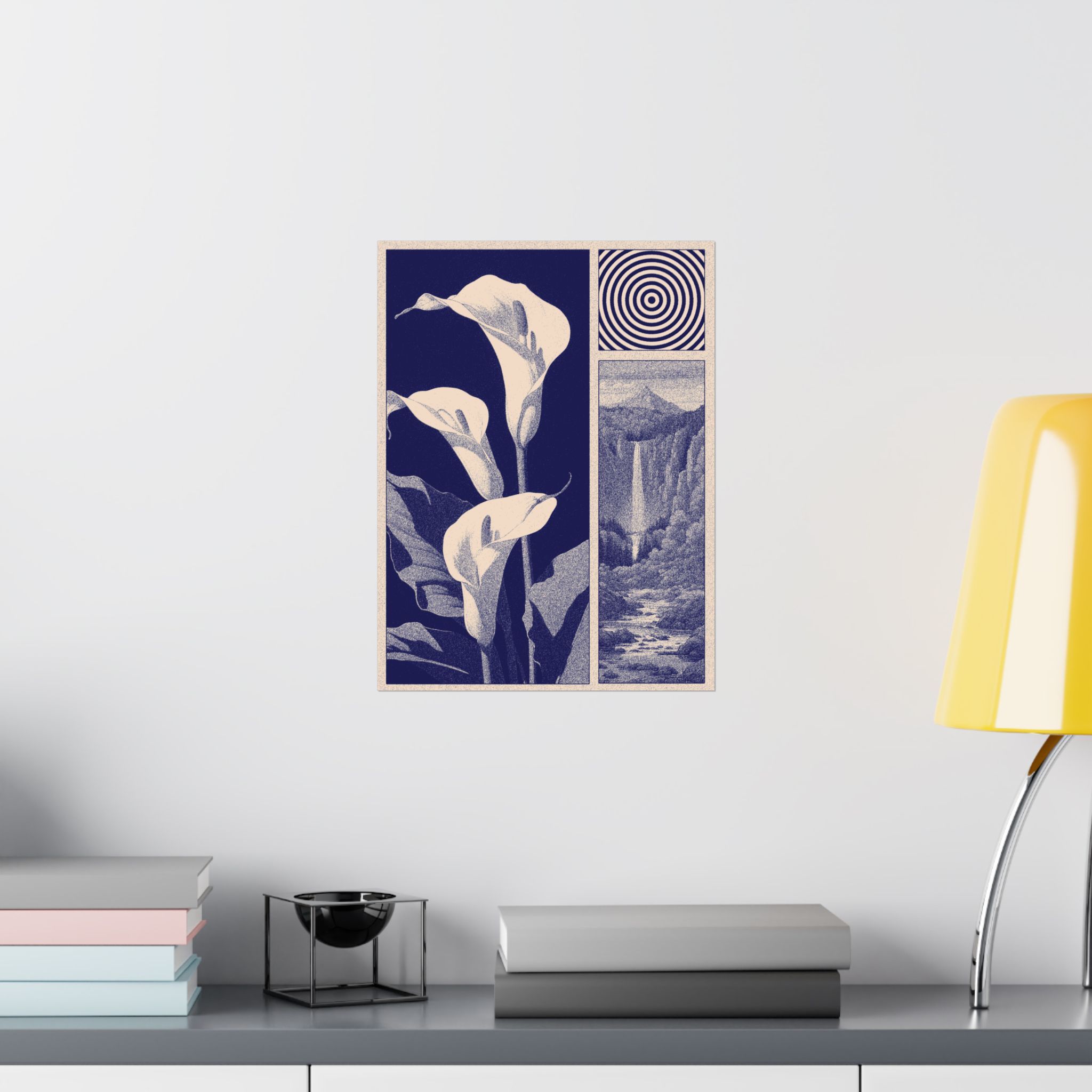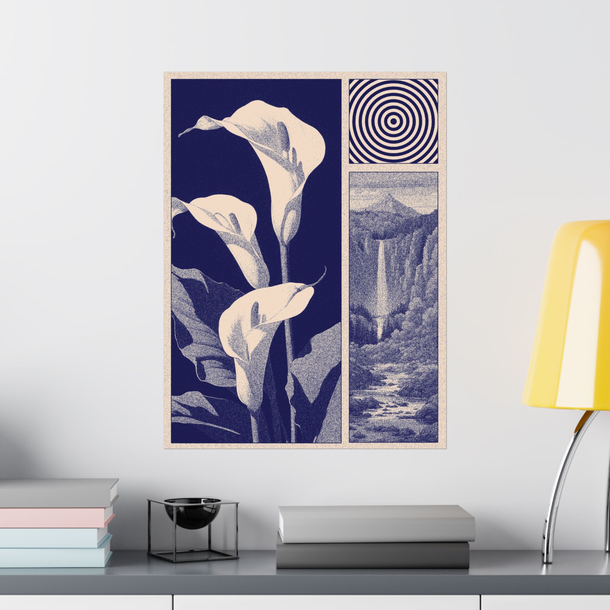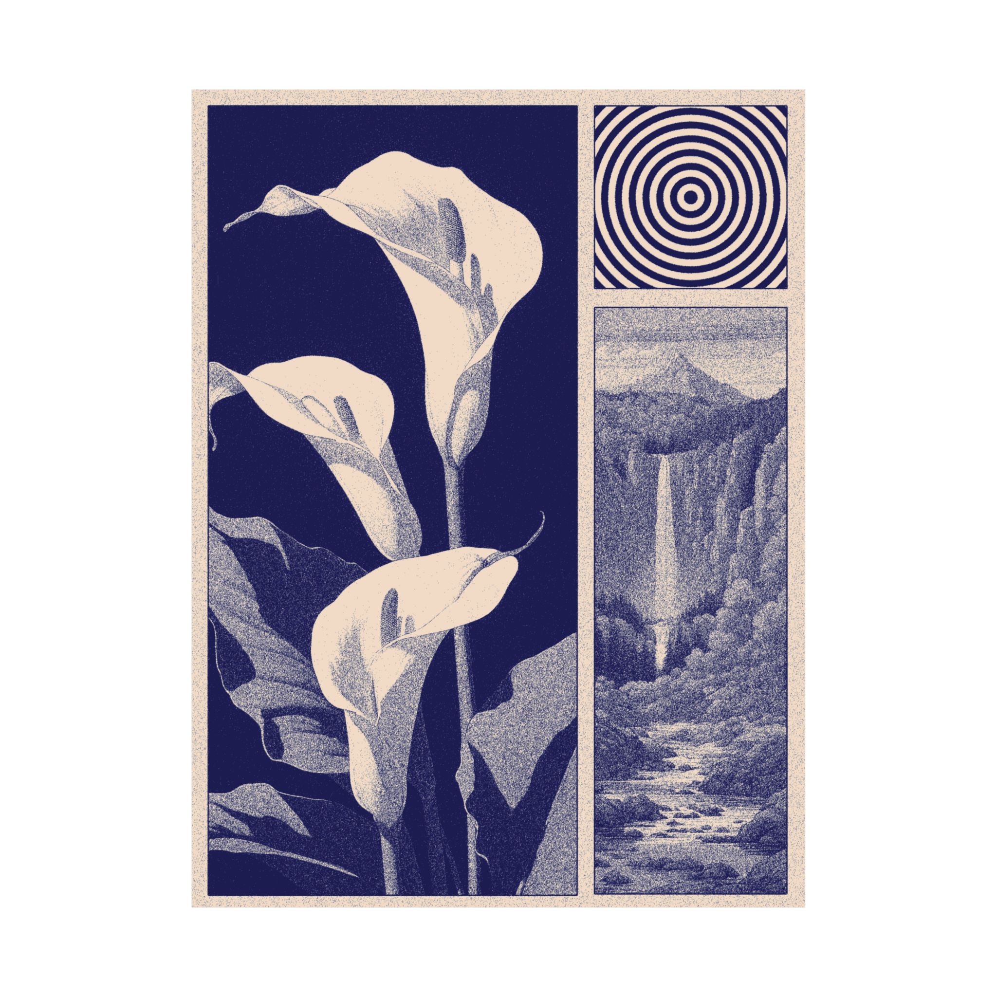 Nothing Ventured, Nothing Gained is a Giclée print featuring a balanced arrangement of calla lilies and a mountain waterfall. Printed on archival-grade Giclée paper, it captures fine detail with soft gradients and deep contrast. The natural texture supports the clean lines and organic shapes, giving the piece a timeless and steady presence. Ideal for quiet spaces or thoughtful interiors, it invites both stillness and focus.